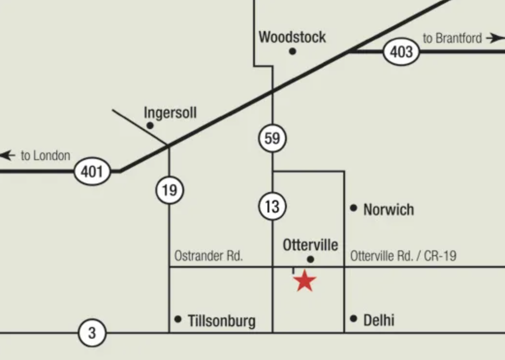 Take the 401 east to Hwy #19 south (exit 218). Travel south for 9.5 km and turn left onto Mount Elgin Rd. Head east on Mt Elgin Rd/County Road 18 for 12 km to Middletown Line. Turn right and travel 6.5 km to Otterville Rd/County Road 19. Turn left and travel 1 km to James Street and turn right.